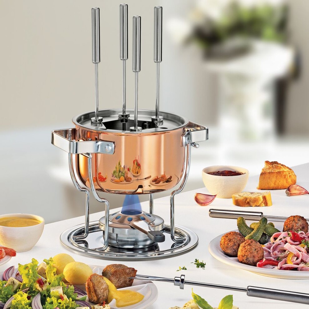 Service à fondue inox & cuivre avec caquelon, réchaud & fourchettes pour 6 perso