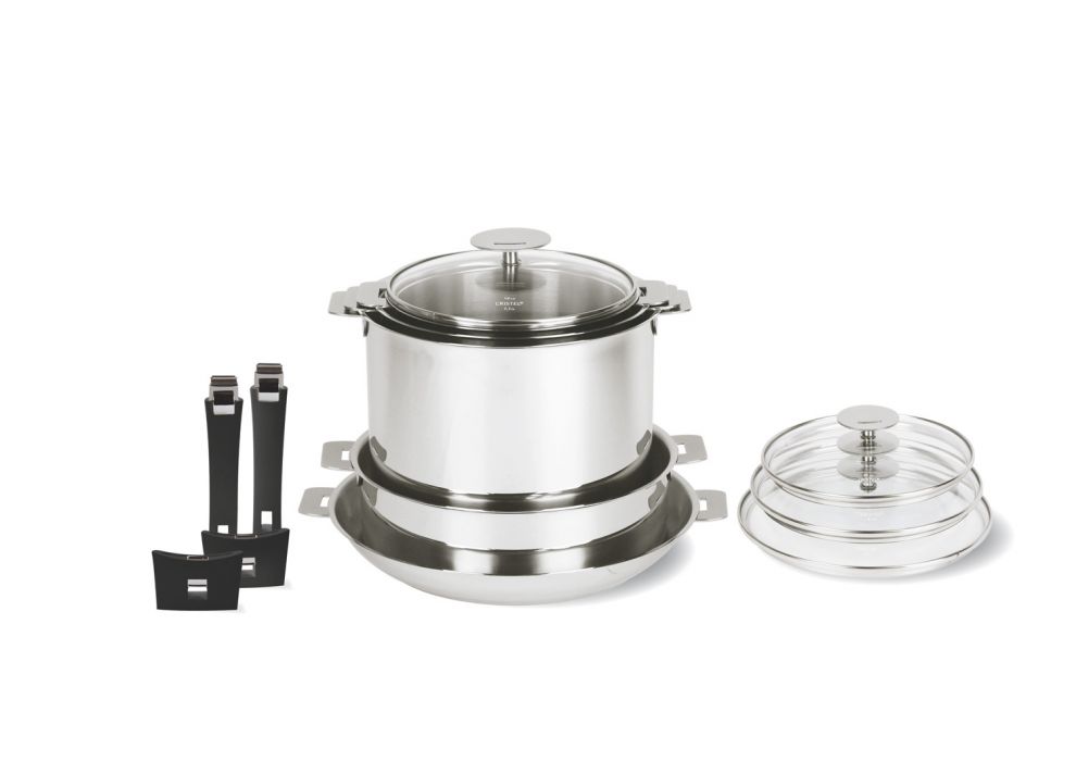 La collection Mutine de Cristel est à la fois la toute première et la dernière née. Elle reprend le principe de la toute première collection de 1983 avec des ustensiles inox 18/10 brillant sur un fond thermo-diffuseur ultra performant pour permettre aux batteries de cuisine de s'adapter à tous les feux, y compris à l'induction.