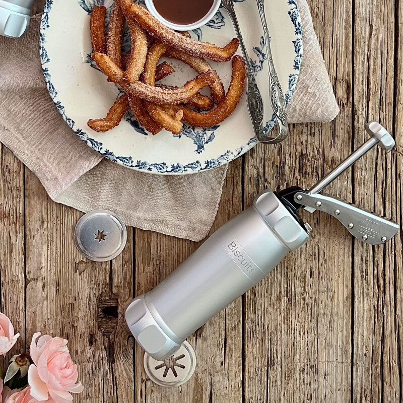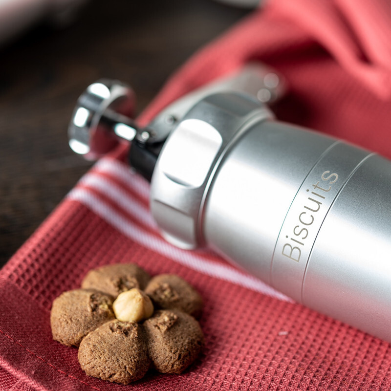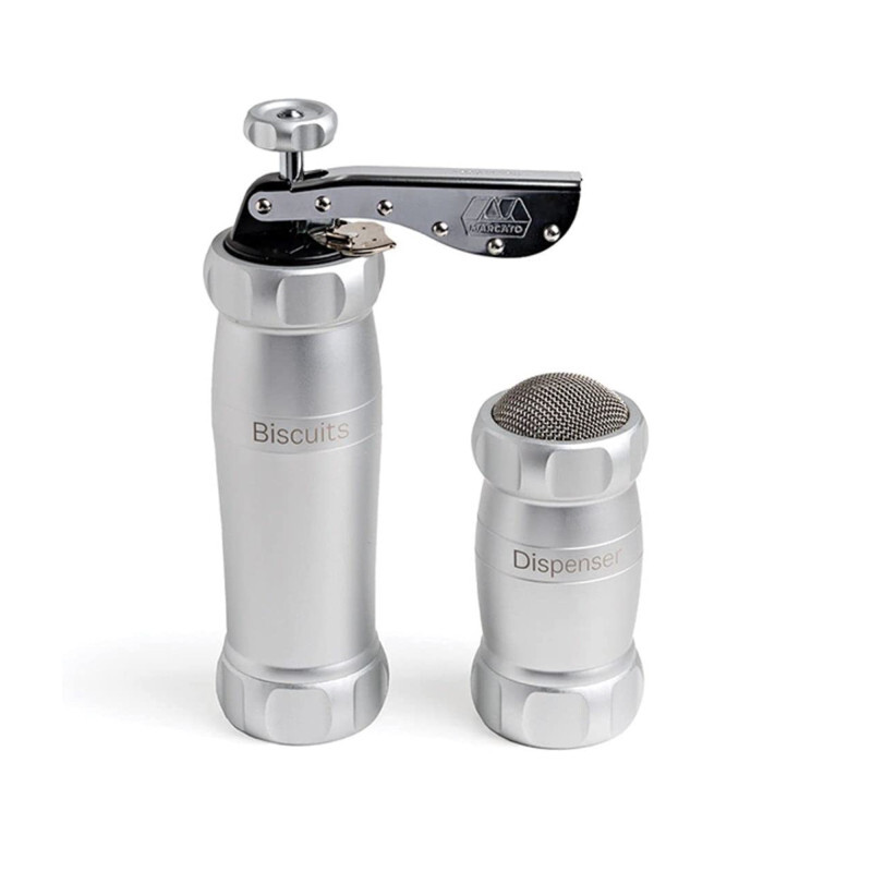 Pour les amateurs de petits biscuits faits maison, voici le set indispensable ! Il comprend une saupoudreuse et une presse à biscuits.