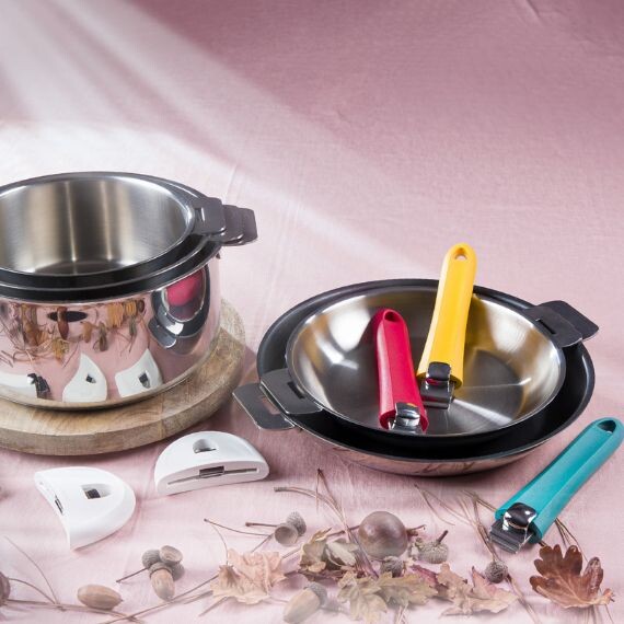 Les poignées amovibles Mutine s’adaptent à tous vos ustensiles de cuisine des collections amovibles Cristel. En effet, casserole, sauteuse ou poêle ; passez de l’un à l’autre en un geste simple grâce aux poignées amovibles.