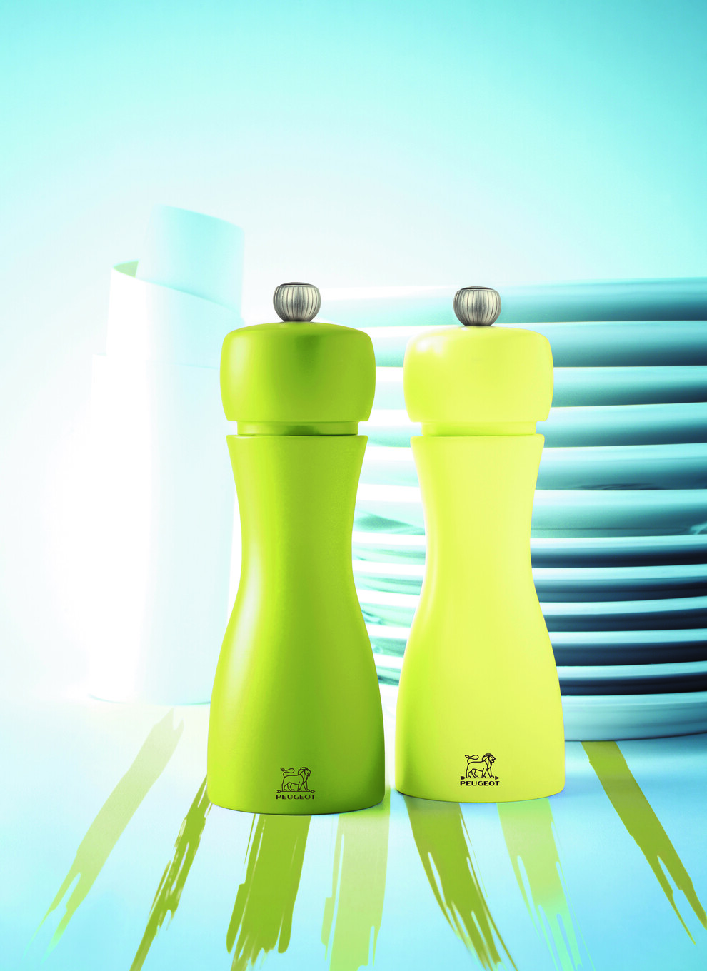 Le set de moulins manuels Tahiti Hiver de Peugeot se compose d’un moulin à poivre et d’un moulin à sel en bois laqué coloré.