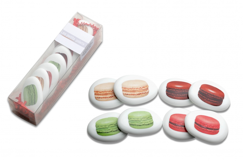 Le set de 8 galets en porcelaine porte couteaux sur le thème du macaron se présente sous forme de boîte transparente très élégante qu’il conviendra aussi parfaitement d’offrir. Ce set est composé de 8 galets sur lesquels vous pourrez admirer des macarons dans des coloris différents.