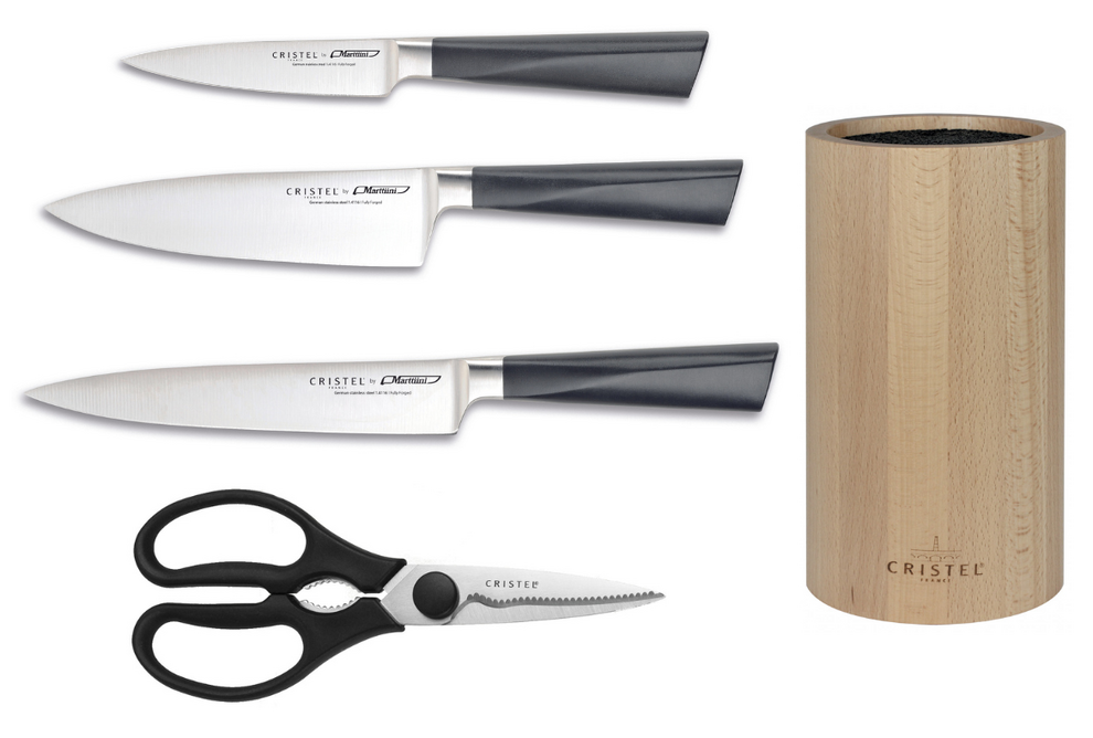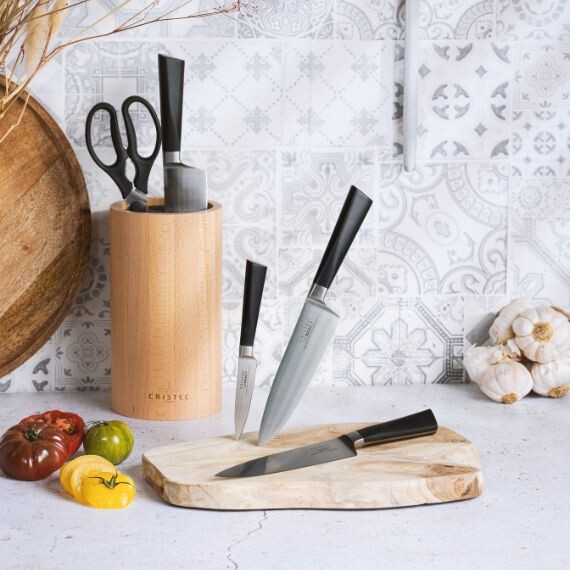 - Cristel choisit de célébrer ce savoir-faire en lançant une gamme de couteaux qui allie tradition et modernité. Le set comprend un bloc à couteaux en hêtre, un couteau d'office, un couteau de chef, un couteau universel et un ciseau de cuisine démontable, offrant une polyvalence exceptionnelle.