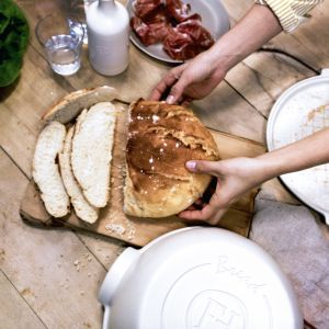 Pensé pour vous faciliter la tâche, une fois retourné, le dôme fait aussi office de bol pour préparer votre pâte et la laisser reposer. Quant au plateau de cuisson, il est strié de croisillons qui évitent au pain d’accrocher. Vous pourrez ainsi varier les recettes et les formes : boule au levain, pain marguerite aux graines, pavé au seigle…
