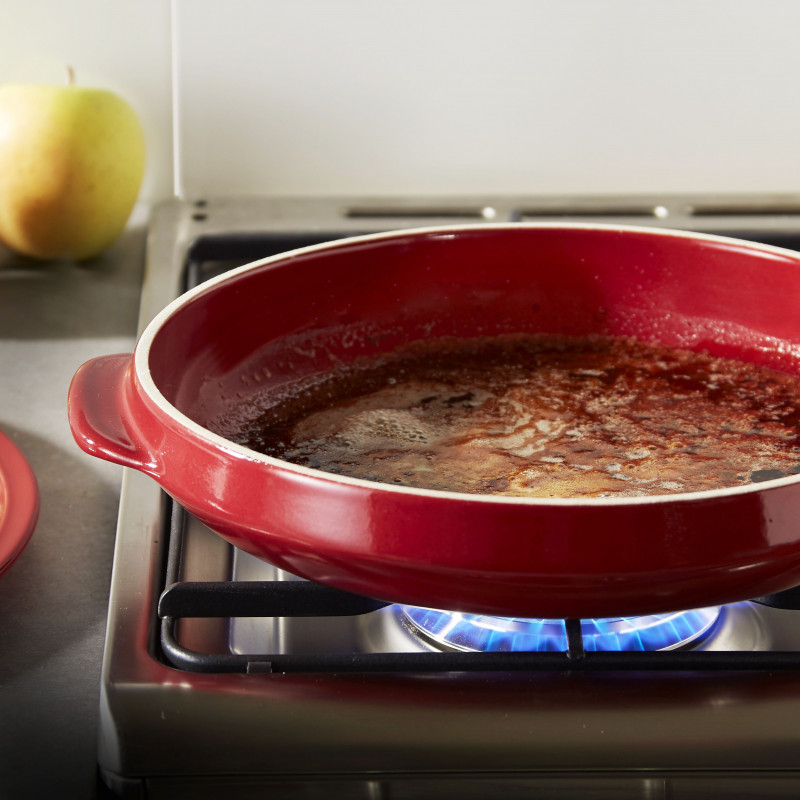 | Préparer directement votre caramel directement sur le feu (le plat est compatible tout feu sauf induction). Pour la cuisson, conservez le même plat pour faire cuire votre préparation au four. | ![]() |