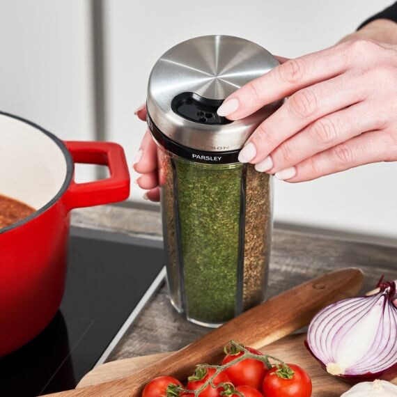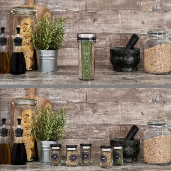 Le shaker à herbes Saunderton est livré avec cinq herbes aromatiques préremplies : basilic, origan, persil, romarin et thym.