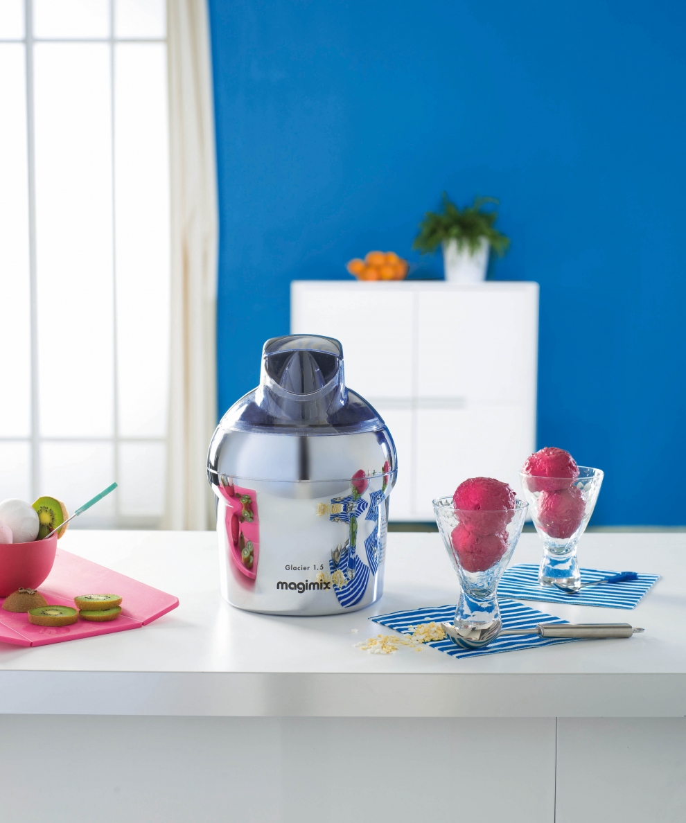 Compacte, colorée et toute en rondeur, la sorbetière à accumulation "Le Glacier" de Magimix permet de réaliser à la maison des glaces et des sorbets 100% naturels