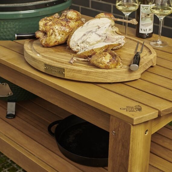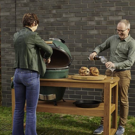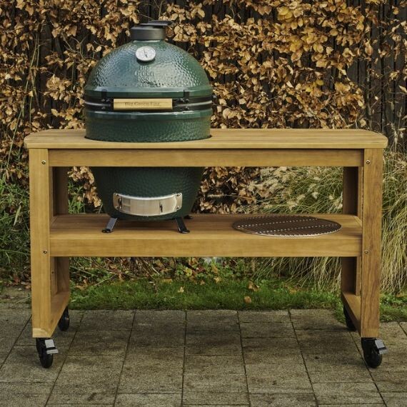 La table en bois d’eucalyptus vous permet de transformer votre Big Green Egg et de le doter d’un beau plan de travail avec toute la place souhaitée pour les ustensiles de cuisine et la préparation des plats.