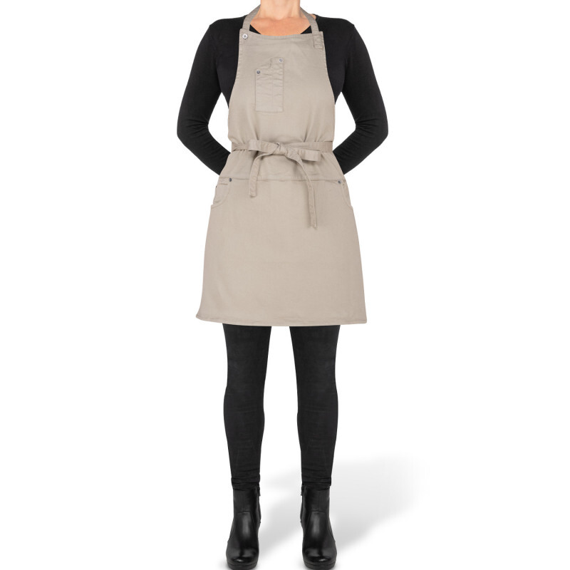 Les lanières pour fermer le tablier peuvent être nouées à l’avant comme à l'arrière. De plus, le tour de cou est réglable facilement avec les bourons de pression.