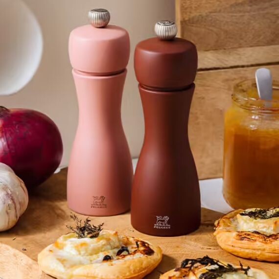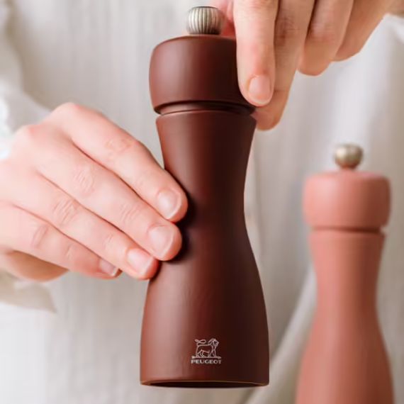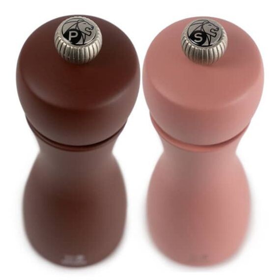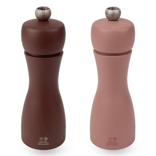 Le set de moulins manuels Tahiti Terre/Marron de Peugeot se compose d’un moulin à poivre et d’un moulin à sel en bois laqué coloré.