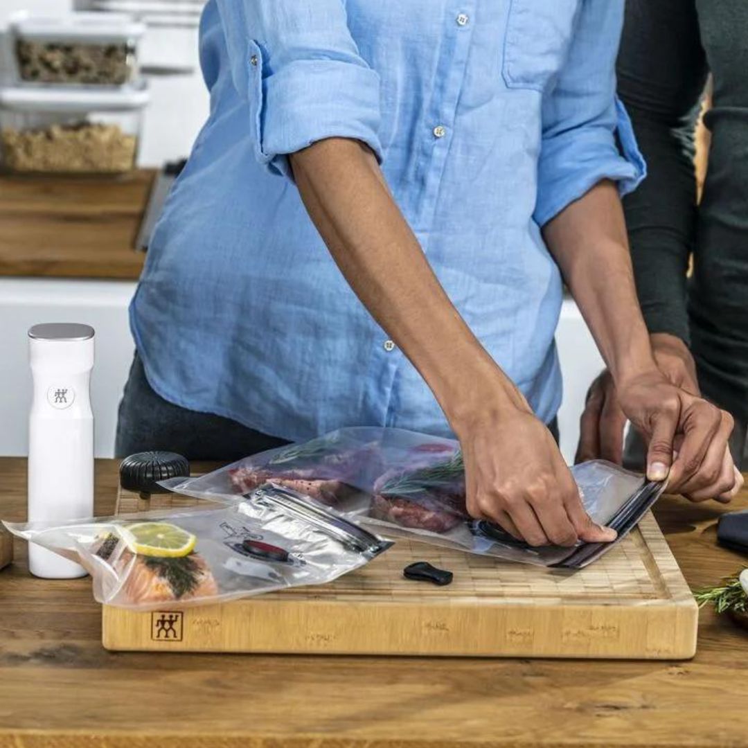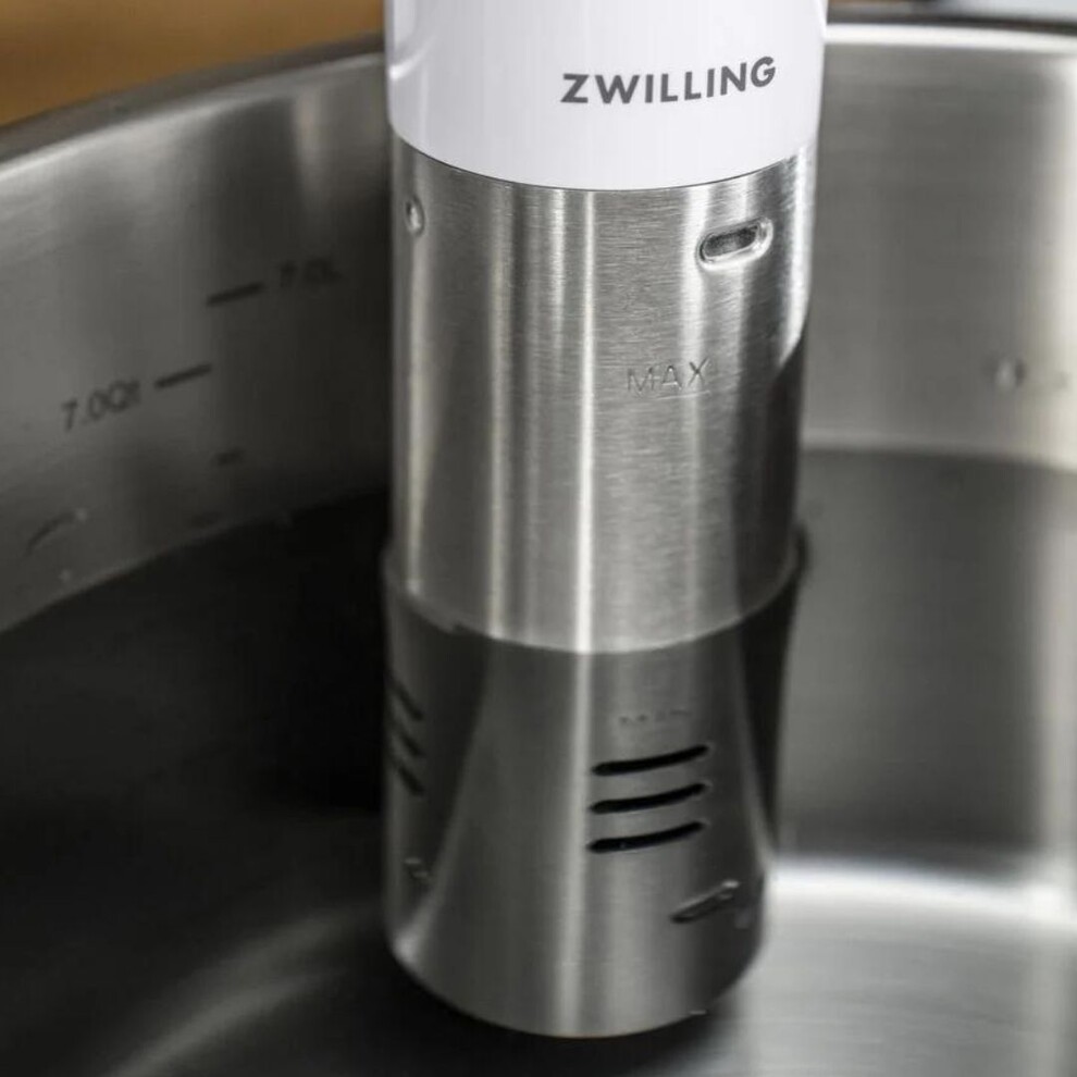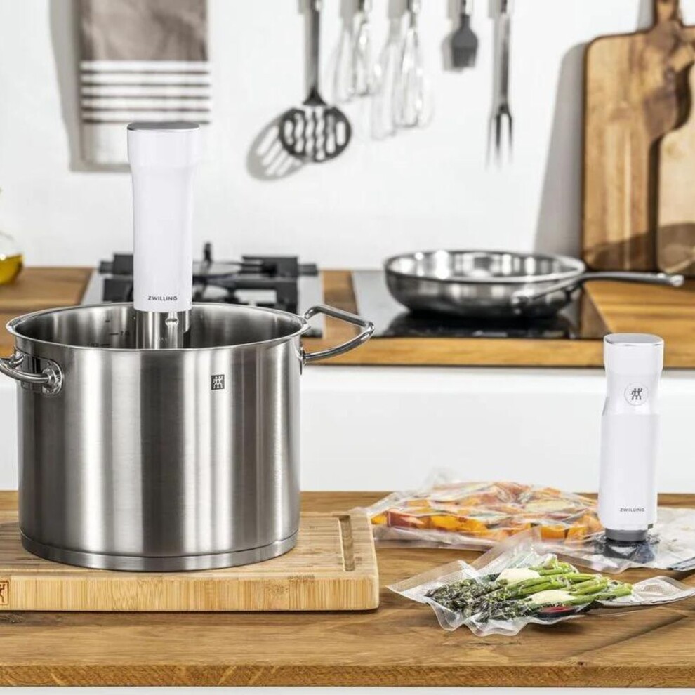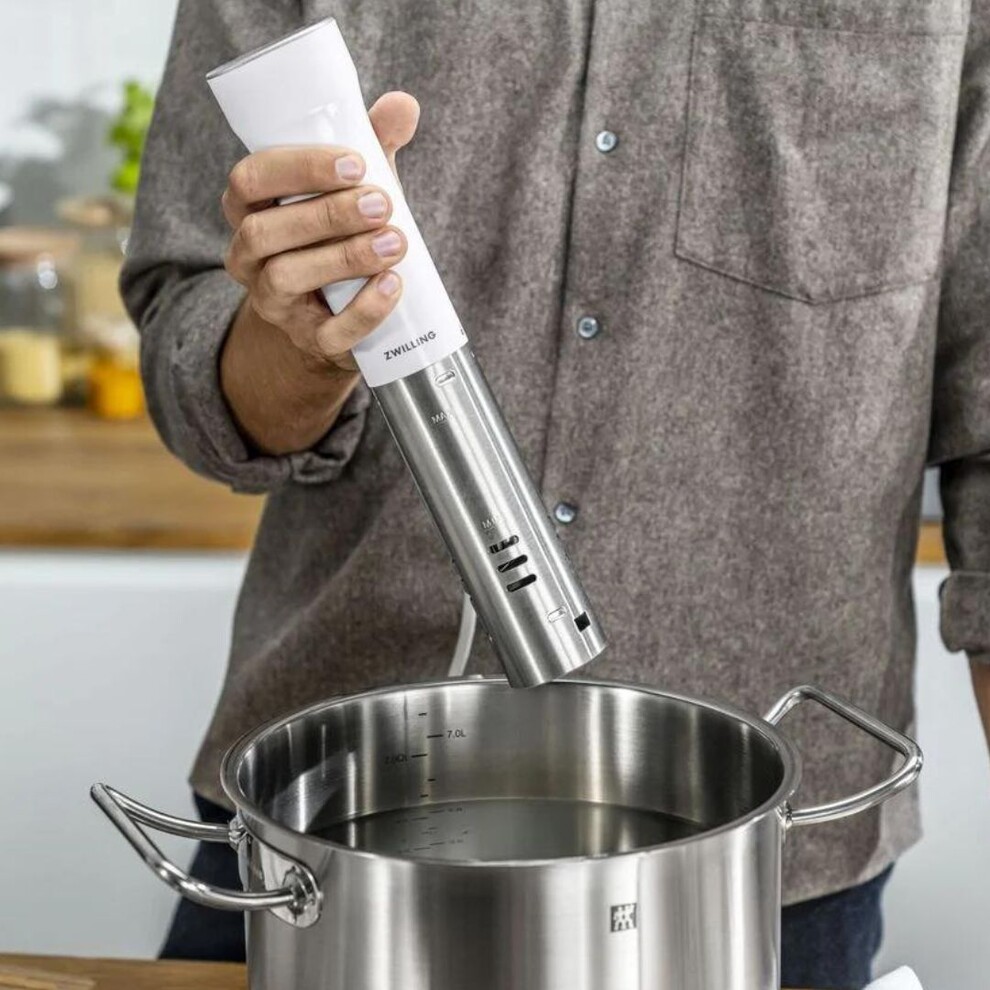 La cuisson  sous vide est un jeu d'enfant avec la game sous-vide Zwilling ! Le procédé est très simple, il suffit de remplir un contenant d'eau, d'y fixer le thermoplongeur et de régler le temps et la température de cuisson. Pendant que votre eau chauffe, préparez vos aliments et mettez les sous vide avec la pompe fresh & save. Une fois la température cible atteinte, ajoutez le sac pour une cuisson au bain-marie. Après la cuisson, vous pouvez aussi saisir très brièvement les viandes pour obtenir une savoureuse croûte délicatement grillée !