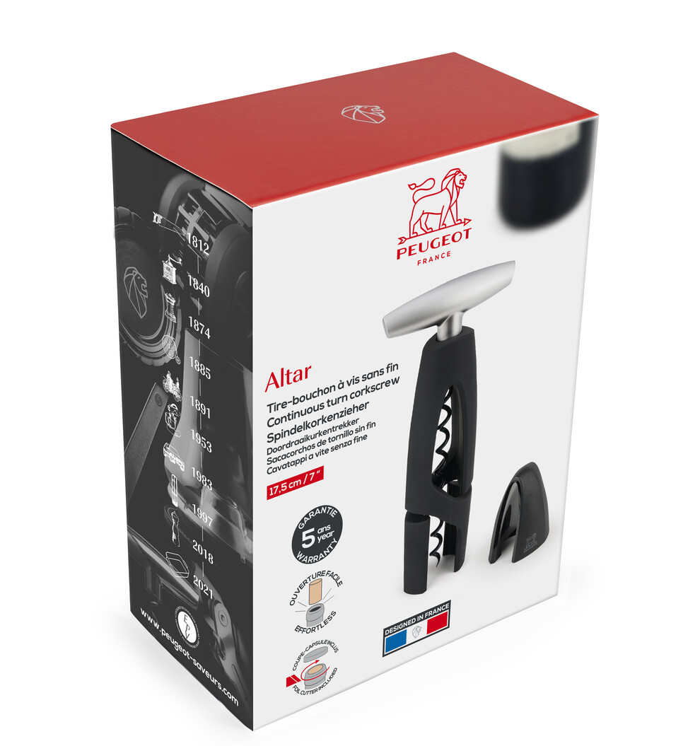 Le tire-bouchon Altar noire de Peugeot est un tire-bouchon à vis fonctionne de manière intuitive grâce à sa vis sans fin. Pratique, il s'adapte à tous les goulots et résiste à tous les chocs grâce à sa conception en plastique ABS haut de gamme. La finition Soft Touch offre une prise en main agréable et stable afin d'extraire les bouchons de manière encore plus aisée.