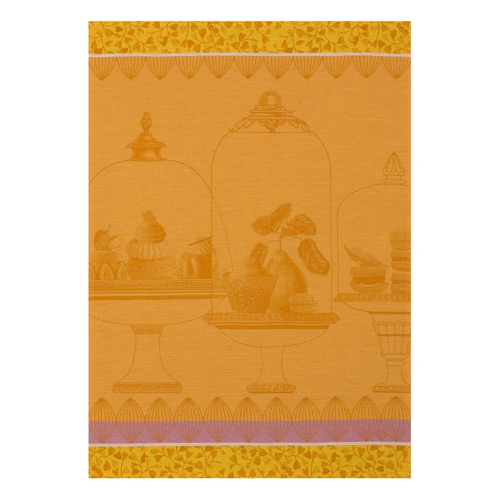 Un torchon Le Jacquard Français à motif Abricot 100% coton illustrant à merveille la pâtisserie française, le tout dans un colorama acidulé.