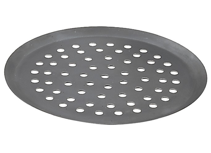 Tourtière ronde perforée à bord bas, en tôle d’acier bleuie, idéale pour la cuisson des tartes, pâtes feuilletées ou brisées, pizzas…