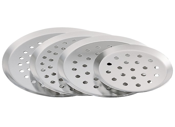 Tourtière ronde perforée, à bord bas, réalisée en aluminium d'épaisseur 1 mm. Plaque à la fois légère et résistante.