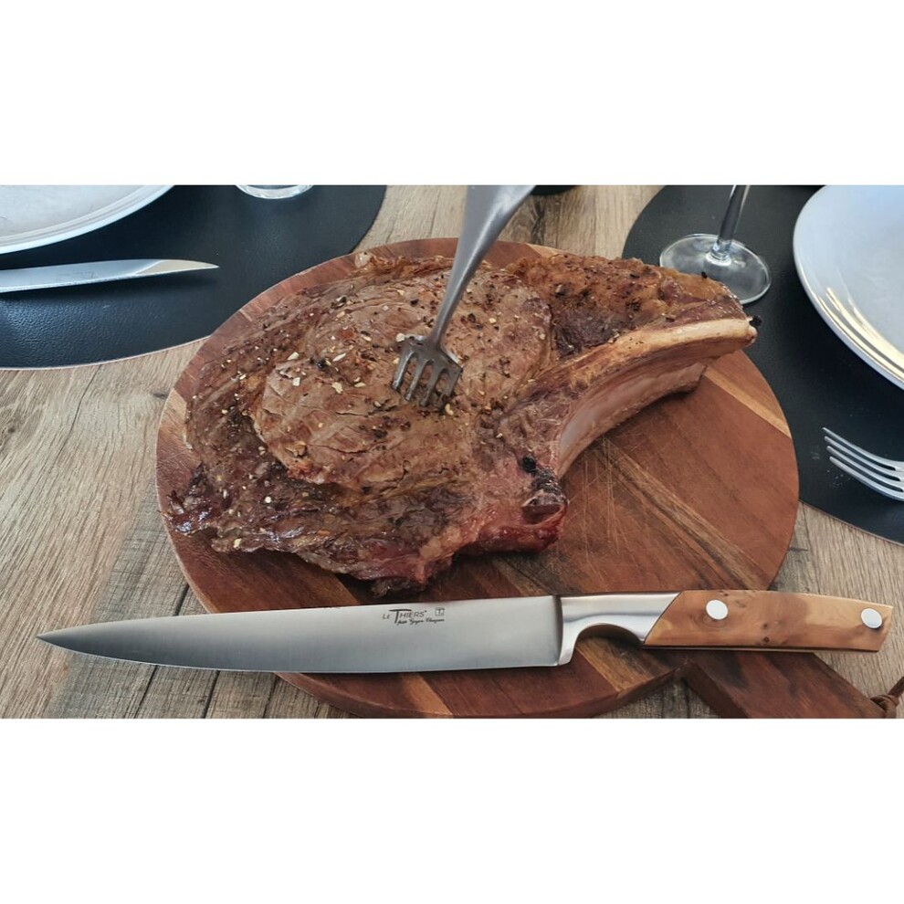 La collection Le Thiers Cuisine redessine le couteau Le Thiers pour répondre aux besoins de la préparation culinaire. Ce couteau à viande, également appelé couteau à trancher ou couteau à découper, est un outil très pratique pour obtenir des tranches nettes et précises.