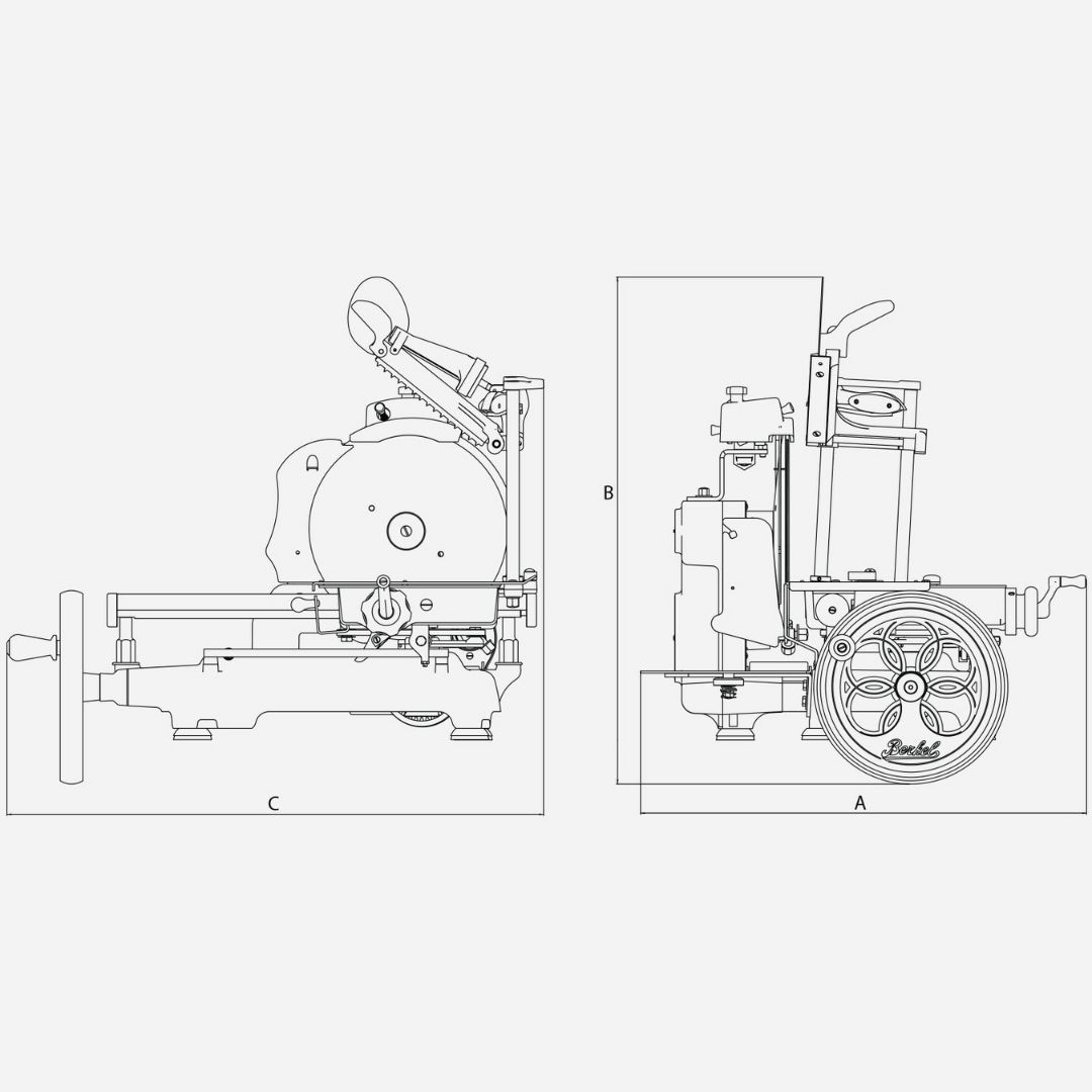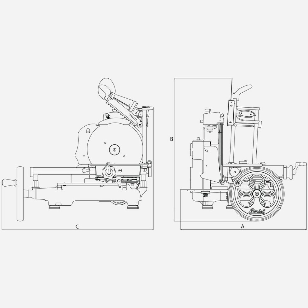 Détails :Mécanisme à vis pour le mouvement du protège-lame; Toutes les décorations et la signature Berkel sont peintes.