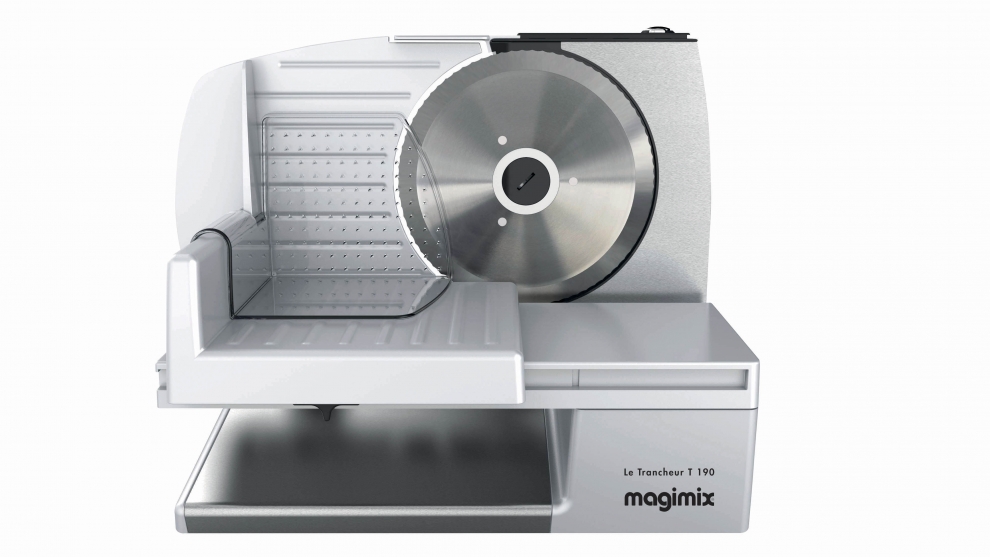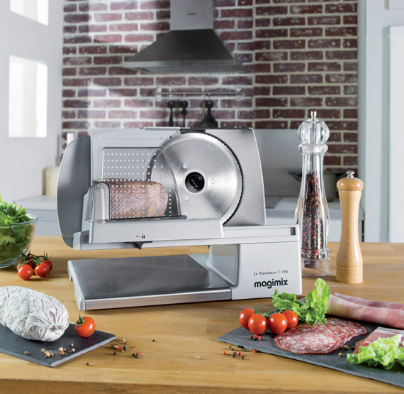 Découvrez le trancheur multifonction de Magimix avec sa lame crantée de 19 cm, et son plateau en inox .