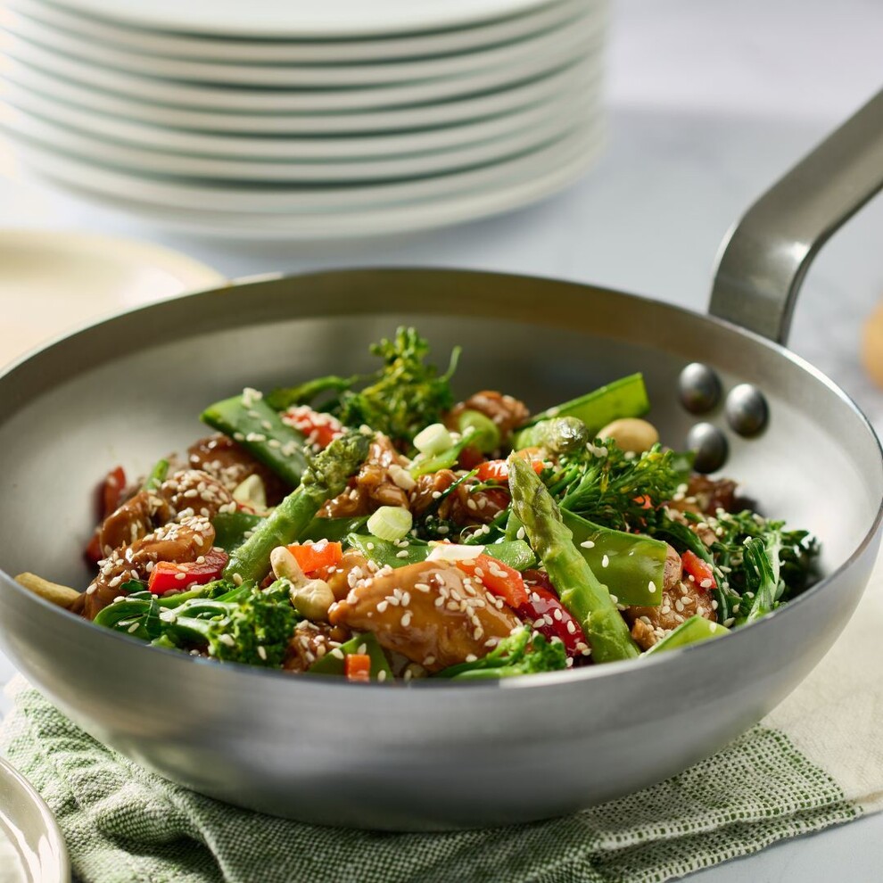Ce wok polyvalente permet toutes les cuissons : saisir, sauter, dorer ou mijoter. Idéale pour préparer de grandes portions, elle excelle notamment pour les pommes de terre sautées. Ses bords hauts réduisent les éclaboussures, ce qui la rend parfaite pour cuire les viandes.