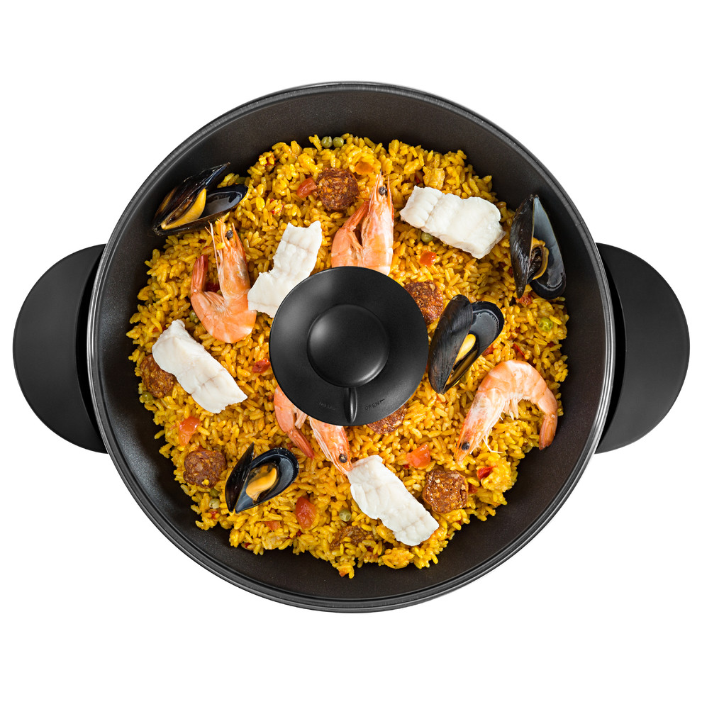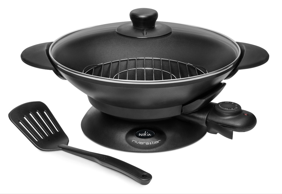 Comme les professionnels, profitez également d'une cuve arrondie avec ce Wok Electrique 5L par Riviera et Bar. Un concept ingenieux reposant sur une resistance intégrée permettant une repartition optimale de la chaleur sur toute la surface de la cuve avec revêtement antiadhésif sans PFOA. Un wok vous procure une cuisson naturellement pauvre en matière grasse, mais avec celui-ci, profitez également d'une cuisson ultra rapide dûe à sa puissance de 2200W et precise grâce à son thermostat 10 positions. Vous n'êtes toujours pas convaincus? Sa grille en inox vous permet de cuire les aliments à la vapeur pour une cuisson totalement diététique. Vous sera fourni également un couvercle en verre avec son disque d'échappement de vapeur réglable et une spatule thermoplastique spécialement adaptées à la cuisson au wok.
