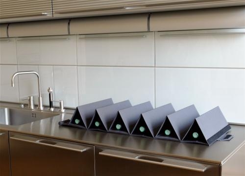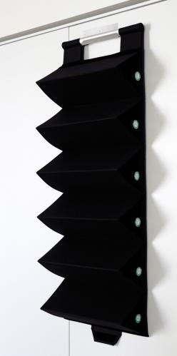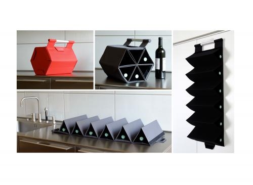Vous obtenez ainsi deux versions déployées du ZEbag : à plat, un présentoir pouvant contenir jusqu’à 11 bouteilles, ou suspendu, un porte-bouteilles mural, original et design.