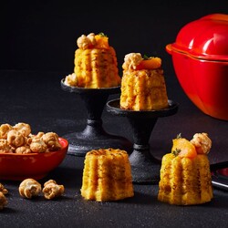 Inspirés par les saveurs d'Halloween, ces cannelés légèrement plus sucrés que salés sont terriblement bons. Un cannelé délicieusement riche à la citrouille, garni de purée de courge musquée, pop-corn et sucre de canne, le complément parfait pour vous mettre dans l’ambiance d’Halloween. Une recette de Le Creuset.