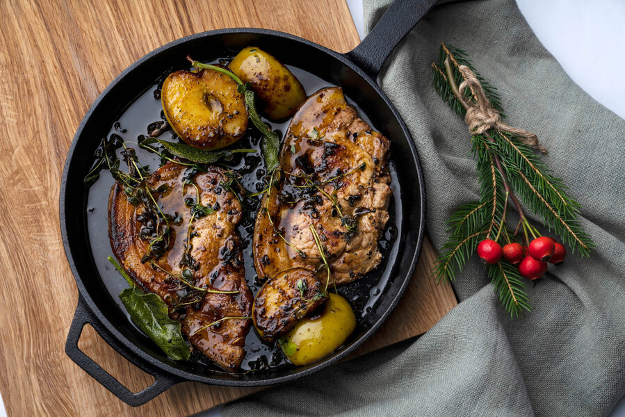 juteux et tendres, et sont servis avec de délicieuses tranches de pommes cuitesau four, caramélisées.