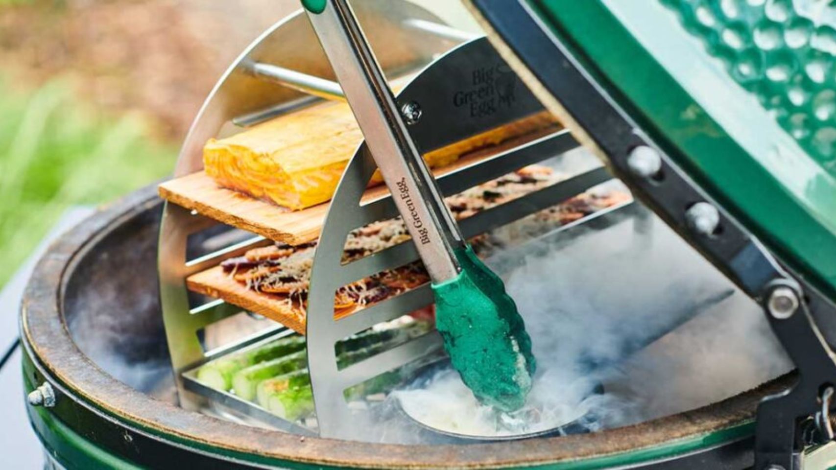 Dans cette recette spécial kamado, la tour de fumage pratique nous permet de préparer un repas complet : un filet de saumon accompagné d’asperges vertes, de patates douces, de tomates et d’un délicieux beurre citronné.