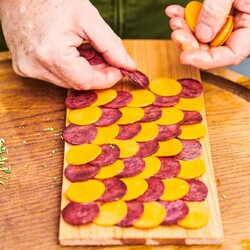 - Lavez les patates douces et séchez-les. Coupez-les en fines tranches à l’aide d’une mandoline. Superposez plusieurs tranches et découpez-les de sorte à former des cercles à l’aide d’un emporte-pièce (Ø 3 cm). Répétez l’opération avec le reste des tranches de patates douces. Versez l’huile d’olive dans un saladier, passez les tranches de patates douces dedans puis placez-les sur la seconde planchette à griller en bois en mélangeant les couleurs. Effeuillez la branche de romarin et la branche de thym et hachez finement les feuilles. Parsemez les herbes sur les tranches de patates douces et saupoudrez-les de parmesan.