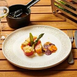 - Pour les légumes, portez à ébullition une casserole d’eau légèrement salée. Coupez les extrémités dures des asperges puis mettez les asperges dans l’eau bouillante et faites-les blanchir pendant environ 1 minute. Sortez les asperges de l’eau, rincez-les à l’eau froide puis laissez-les bien s’égoutter. Arrosez-les d’une cuillère à soupe d’huile d’olive, placez-les sur la grille de la tour de fumage, et salez et poivrez-les à convenance. Coupez les tomates pomodori en tranches d’environ 2 centimètres d’épaisseur et placez-les à côté des asperges sur la grille. Mélangez la seconde cuillère à soupe d’huile d’olive au panko et étalez le mélange sur les tranches de tomates.