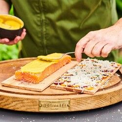 - Allumez le charbon de bois dans le Big Green Egg et faites-le chauffer à une température de 170 °C avec le convEGGtor en place à l’intérieur. Vérifiez que le filet de saumon ne contient pas d’arêtes et retirez-les si vous en trouvez. Placez le filet de saumon sur la peau sur une planchette à griller en bois de cèdre de la tour de fumage. Assaisonnez de sel et de poivre, et badigeonnez le dessus et les côtés de moutarde.
