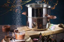 Dans le faitout BIOME verser 500ml d’eau et mettre le cuit-vapeur, avec le moelleux et le couvercle. Monter à pleine puissance de la plaque de cuisson.