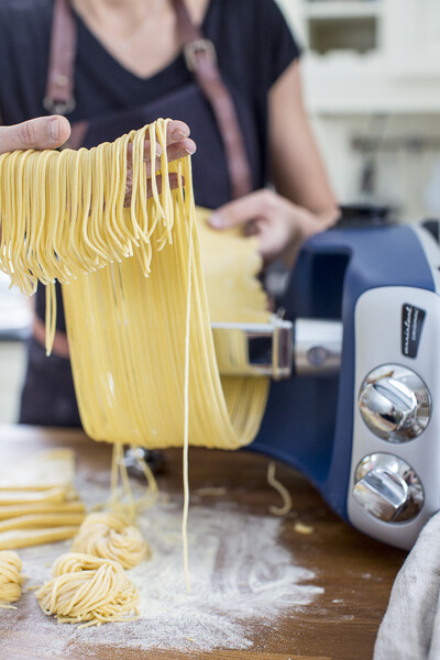 - Assemblez l'Assistent avec le bol en inox, le couteau et le rouleau à pâte