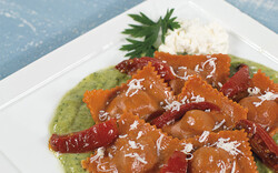 Accueil > Espace Recettes > Ravioli roses à la burrata sur une crème de courgettes avec des files de tomates confites