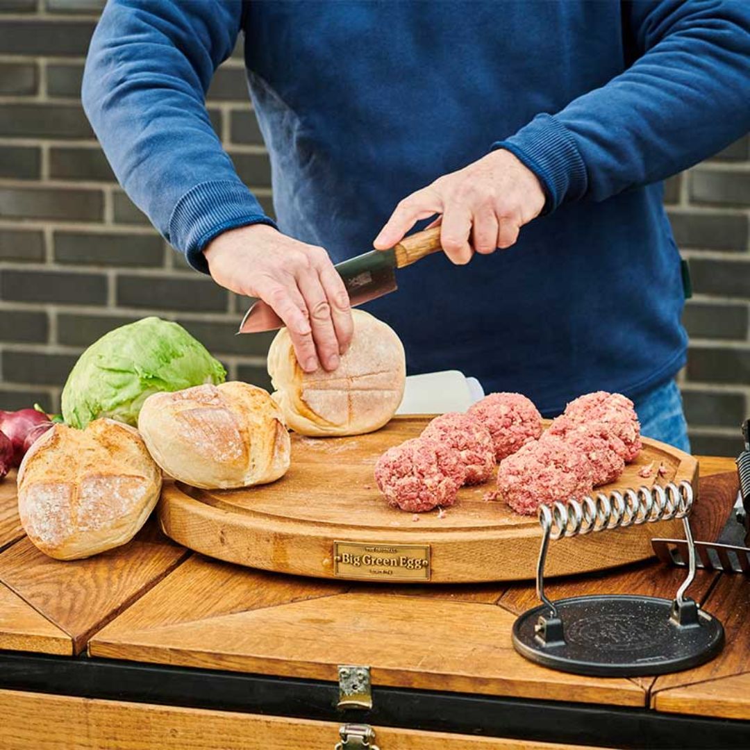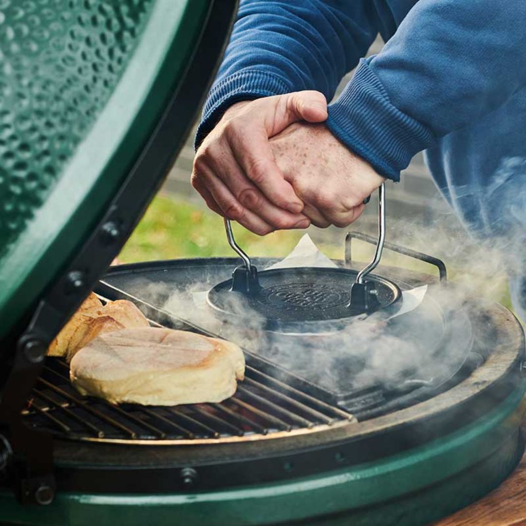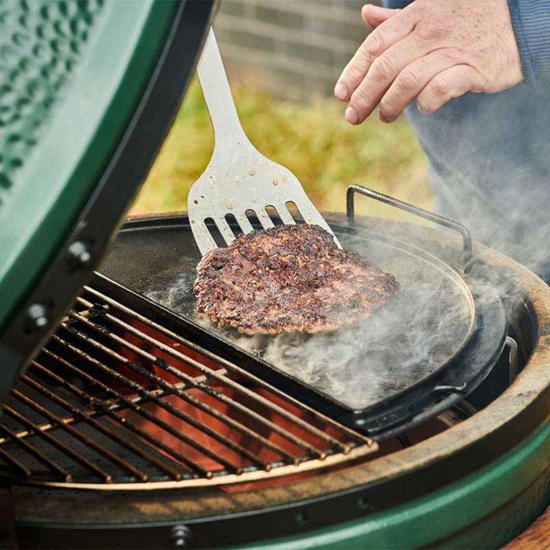 Avez-vous déjà essayé de préparer un smash burger avec votre Big Green Egg ? Le principe est simple : prendre une boulette de viande hachée, l’aplatir pour former un hamburger fin, et le faire griller rapidement à haute température. Cette méthode intensifie la réaction de Maillard, ce qui donne à la viande une saveur riche et caramélisée. Grâce à la cuisson rapide sur votre kamado, l’intérieur du burger reste incroyablement juteux, tandis que l’extérieur devient parfaitement croustillant. Pour cette recette, nous recommandons d’utiliser un hachoir à viande pour mélanger du lard gras à de la viande de bœuf maigre, ce qui enrichit la texture et le goût. Pas de hachoir ? Pas de problème ! Vous pouvez simplement préparer vos boulettes avec du bœuf haché classique. Le résultat sera tout aussi délicieux !