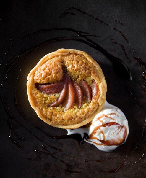 La frangipane est un mélange de beurre, de sucre et de fruits oléagineux moulus (généralement des amandes) ; elle peut servir de base à toutes sortes de tartes aux fruits. En pochant les poires dans du vin rouge, elles prennent à l’extérieur une superbe couleur rouge foncé, qui contraste avec la chair douce et moelleuse à l’intérieur.