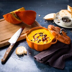 7) Lorsque le programme est terminé, ôter le couvercle et assaisonner de nouveau. Décorer le velouté de potimarron avec l'huile de pépins de courge et les graines de courge et déguster. Servir avec des croutons.